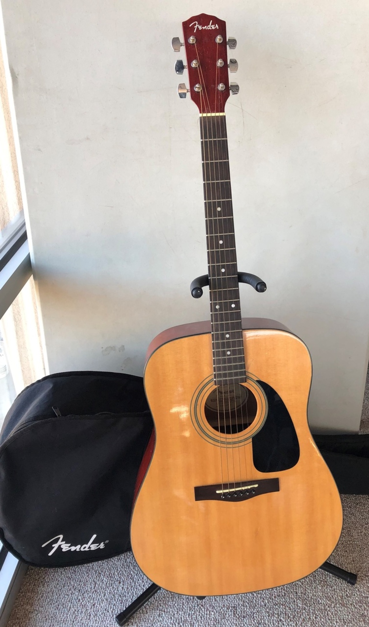 Fender acoustic guitar with case and stand (used).